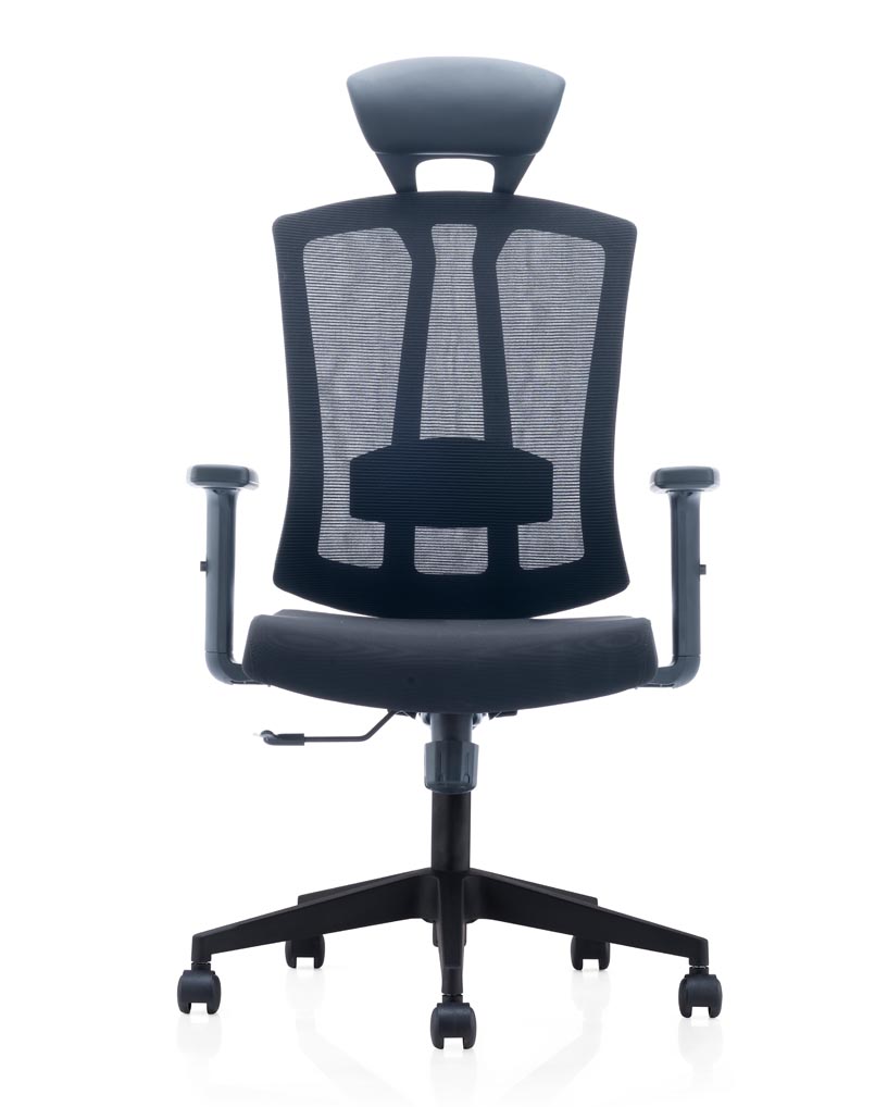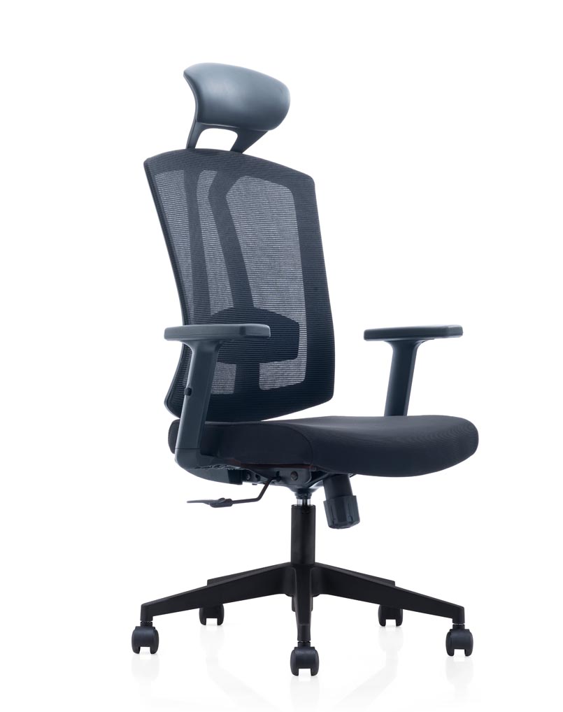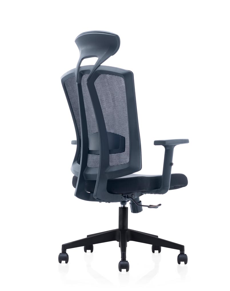 Executive Office Chair with black frame mesh back, fabric seat.